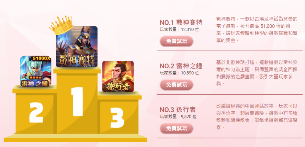 題材選擇豐富,包含免費遊戲、倍數機制與掉落連擊等特色。新手可先用試玩模式熟悉線路與玩法,再以小額實戰提升手感。